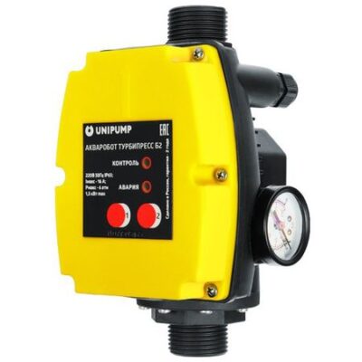 Unipump (Юнипамп) ТУРБИПРЕСС Б2 представляет собой блок автоматического управления двумя насосами, включенными параллельно. Прибор позволяет поддерживать в системе водоснабжения давление в пределах от 0,5 до 5 бар. Кроме того, оборудование способно автоматически задавать режим работы секций (попеременный либо совместный), что способствует значительной экономии ресурса электрических насосов. Данный блок автоматически отключает насосы при повышении давления в системе выше 5,5-7 атм, а также в случае полного отсутствия воды в системе водоснабжения, что предупреждает сухой ход . Прибор может работать совместно с насосами, максимальная производительность которых составляет 120 л/мин.