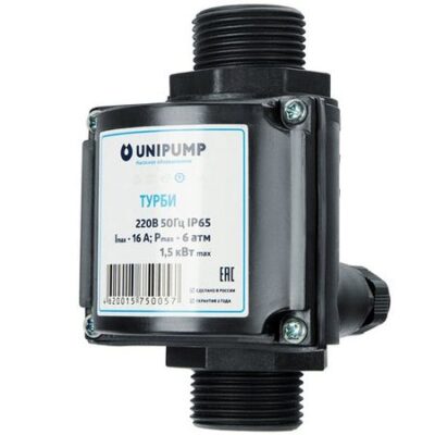 Блок управления насосами модели Unipump (Юнипамп) ТУРБИ применяется для автоматического управления запуском и отключения однофазных погружных и поверхностных насосов, мощность которых не превышает 1,5 кВт. Также, прибор может использоваться для автоматического выключения насоа при прекращении подачи воды в системе водоснабжения, то есть для защиты от работы насосного оборудования в режиме сухого хода . Этот блок управления рассчитан на эксплуатацию в системе, максимальное давление в которой не превышает 6 атмосфер. Монтаж прибора в системе должен осуществляться между гидроаккумулятором и точкой водозабора.