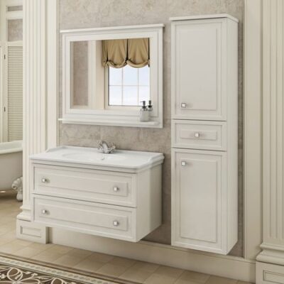 Подвесная шкаф-колонна в неоклассическом стиле. Оригинальные квадратные ручки кнопки. Верхняя, нижняя створки и ящик оснащены системой плавного закрывания.