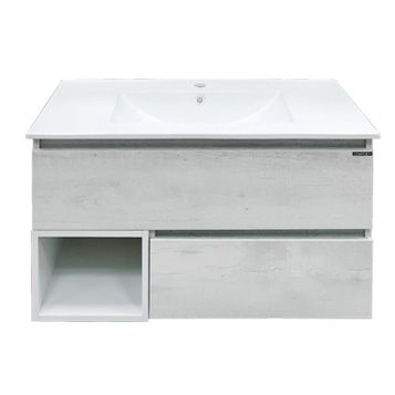Подвесная тумба-умывальник в современном стиле с большим выкатным ящиком и боковой створкой. Ящик оснащены системой открытия при нажатии Push-to-Open.