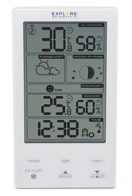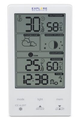 Метеостанция Explore Scientific (Иксплоре Сайэнтифик) Classic Vertical позволяет измерять температуру, влажность воздуха, прогнозировать погоду на 12 ч. Отличительной стороной данной модели является функция предупреждения заморозок. Кроме основных функции метеостанции, с которой гаджет справляется безупречно, данная модель оснащена часами, будильником, показывает фазы Луны.