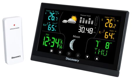 Levenhuk (Левенгук) Discovery Report WA20 — метеостанция с выносным датчиком. Отличный помощник для тех, кто мониторит показатели температуры и влаги в помещении и на улице. Помимо контроля в реальном времени, устройство составляет тренды на ближайшее время. Удобная функция часов и будильника, расширяющая возможности изделия.