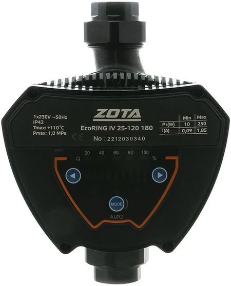 Циркуляционный насос Zota (Зота) EcoRING IV 25-120 180 оснащен резьбовым способом присоединения и устанавливается вертикально. Встроенный частотный преобразователь обеспечивает широкий диапазон настроек скорости работы устройства, что позволяет находить баланс между производительностью и экономичностью.