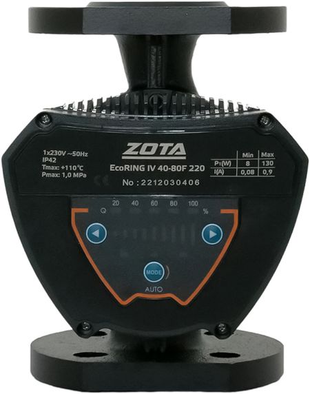 Циркуляционный насос Zota (Зота) EcoRING IV 40-80F 220 оснащен частотным преобразователем, который обеспечивает более точную настройку работы. Наличие такого способа настройки позволяет организовать ночной или экономичный режим отопления. Управление происходит при помощи лицевой панели со светодиодными указателями.