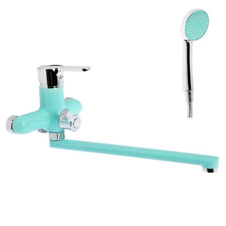 Настенный смеситель имеет длинный поворотный излив и рычаг для регулирования подачи воды. Режим «Душ» переключается поворотом вентиля. Сантехника выполнена в синем цвете.В комплект входит душевая лейка и шланг.