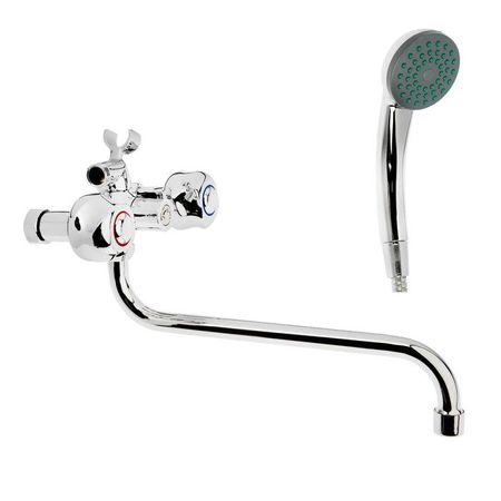 Смеситель имеет длинный поворотный излив и 2 вентиля для регулирования подачи воды. Режим «Душ» переключается поворотом рычага. Сантехника устанавливается на стену. В комплект входит душевая лейка и шланг.