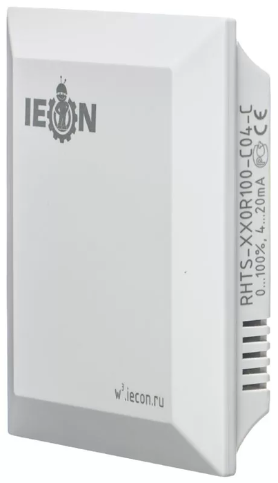 IECON (Аекон) RHTS-XX0R100-C04-С это комнатный датчик влажности, выполненный в компактном пластиковом корпусе белого цвета. Класс защиты модели IP20. Помимо влажности, данный прибор также осуществляет измерение температуры воздуха при помощи встроенного чувствительного элемента Pt1000 класса В.