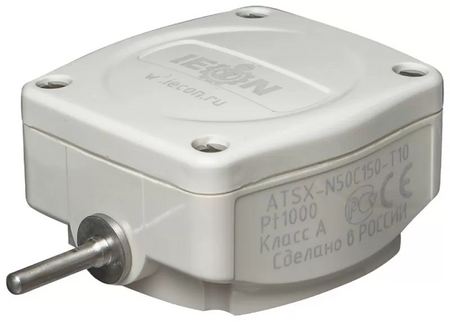Уличный датчик температуры IECON (АЕКОН) ATSX-N50C150-N10 в защищенном IP67 пластиковом корпусе для накладного монтажа. Диапазон измерений: -50…+150 градусов. Рекомендуется установка в тени, желательно чтобы не попадали прямые солнечные лучи. Конструкция включает сальник для ввода кабеля и резьбовое соединение для надежности.
