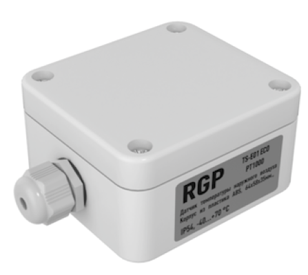 Наружный датчик RGP (РГП) TS-E01 ECO NTC10k (3950) для измерения температуры уличного воздуха имеет сальник для ввода кабеля и выполнен в пластиковом корпусе. Внутри расположен резистивный элемент, который изготовлен методом порошковой металлургии из оксидов, галогенидов металлов, защищен от воздействия окружающей среды каплей стекла.