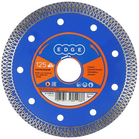 Диск алмазный ультратонкий PATRIOT EDGE алмазный Турбо 125х2223 предназначен для разрезания керамогранита, гранита, мрамора, керамики с использованием ручных резчиков и плиткорезных станков. Ультратонкая, Х-образная режущая кромка обеспечивает чистый рез без сколов. Диск имеет усиление в районе посадочного отверстия для повышения жесткости и снижение вибрации.Наружный диаметр: 125 мм, внутренний диаметр: 22, 23 мм, толщина алмазного слоя:1,2 мм, высота алмазного слоя: 7 мм. Применяется для аккуратного и точного распила плитки без трещин и сколов, работа с водой: нет.Основные характеристики:Тип: дискТип диска: алмазный ультратонкийТип реза: сухойДля работы с материалом: по керамограниту, граниту, мрамору, керамикеМаксимальное число оборотов: 12250 об/минДиаметр диска: 125 ммПосадочный диаметр: 22 мм, 23 ммТолщина диска: 1.2 ммГабариты: 12.5×12.5×0.3 смВес: 0,1 кгЦвет: серый/голубой