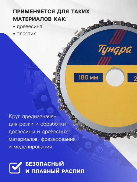 Диск пильный цепной для УШМ ТУНДРА, 180×22 мм. Диск пильный ТУНДРА предназначен для совместного использования с угловой шлифовальной машиной. Пильный диск применяется для реза таких материалов как ДСП, МДФ и фанера. Изделие оснащено по окружности пильной металлической цепью, которая обеспечивает плавность и точность реза. Диск адаптирован к быстрому вращению, благодаря чему увеличивается скорость работы.