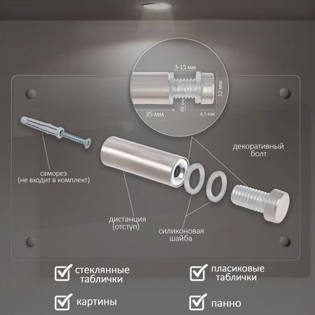Дистанционный держатель для табличек, 12×40 мм, цвет матовый никель, набор 10 шт.. Дистанционный держатель предназначен для закрепления информационных табличек на определенном расстоянии от стены. Крепление на стену осуществляется с помощью шурупа (самореза).