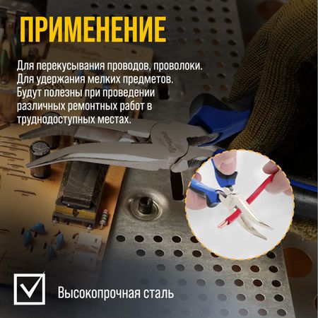 Длинногубцы изогнутые ТУНДРА, CrV, никелированные, двухкомпонентные рукоятки, 200 мм. Длинногубцы марки TUNDRA – применяются для сгибания и разгибания пластин, проволоки, прутков, но в отличие от классических плоскогубцев имеют тонкие и длинные кончики, для выполнения более точной работы и захвата мелких деталей. Эргономичные двухкомпонентные противоскользящие рукояти обеспечат удобство во время использования. <b> Преимущества длинногубцев изогнутых TUNDRA:</b> <ul> <li> Работа в труднодоступных местах благодаря изогнутым губкам;</li> <li> Работа с мелкими деталями;</li> <li> Никелированная поверхность;</li> <li> Качественная сталь CrV;</li> <li> Двухкомпонентные рукояти.</li> </ul>