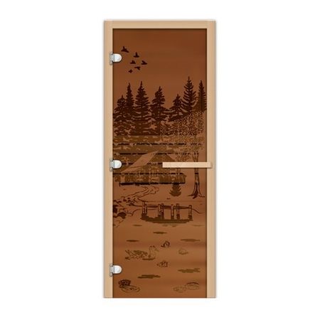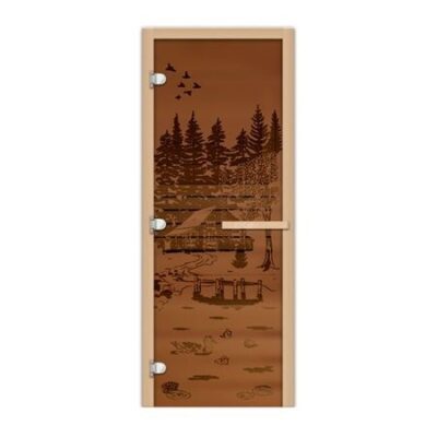 Дверь Fireway (Фаервэй) 1,9х0,7 стекло Банька в лесу бронза 8 мм матовое ЛЕВАЯ обладает устойчивостью к пару и высокой температуре. Панель из матового стекла бронзового оттенка дополнена стильным рисунком. Изделие отличается простотой монтажа, высоким качеством исполнения, надежностью эксплуатации. Петли для крепления модели расположены с левой стороны.