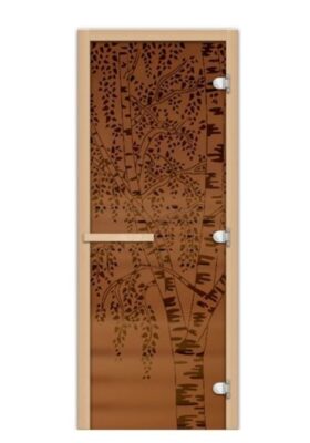 Полотно двери Fireway (Фаервэй) 1,9х0,7 стекло Березка бронза 8 мм крепиться на три хромированные петли, а на деревянной ручке находится магнитная защелка. Порога нет, щель под дверью используется как приточка для вентиляции парилки. Стеклянная модель имеет приятный внешний вид и идеально подойдет для любого интерьера.