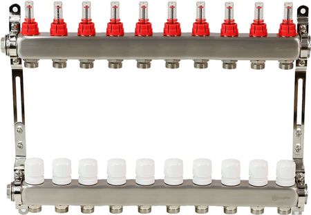Коллекторный распределитель Aquasfera (Аквасфера) 1″ ВР/ВР 10 вых 3/4″ НР (9503) используется в отопительных системах. Основная задача — удобное и быстрое разделение потока воды на несколько индивидуальных контуров. Благодаря установленным расходомерам можно настроить поток теплоносителя и отрегулировать температуру в помещении.