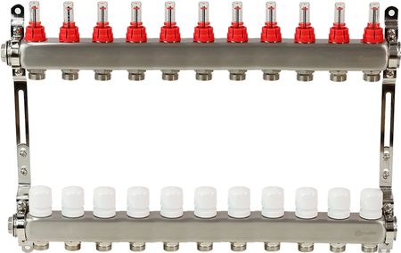 Стальной коллектор Aquasfera (Аквасфера) 1″ ВР/ВР 11 вых 3/4″ НР (9503) используется для разводки отопительной системы на 11 независимых контуров. За настройку каждого отвода отвечает расходомер с понятным и удобным способом настройки. Также производится удаление завоздушивания и дренаж теплоносителя.