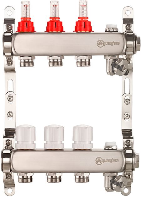 Российский бренд Aquasfera — один из лидеров в производстве доступной и надежной арматуры для различных систем. Линейка 9501 состоит из распределительных коллекторов для отопительных систем, которые не подходят для использования в водоснабжении. Покупателям доступен выбор изделий с максимальный количеством контуров 12 штук. Каждый коллектор оснащен воздухоотводчиком и дренажным краном.