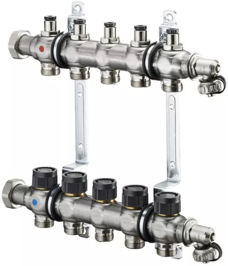 Гребенка модели Oventrop (Овентроп) Multidis SF 5 3/4 изготовлена из нержавеющей стали. Подающая балка оснащена регулирующими вставками, а обратная термостатическими вентилями, обеспечивающими возможность регулирования температуры в помещении. Данный коллектор рассчитан на 5 отопительных контуров.
