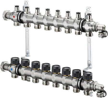 Серия Multidis SF от немецкого производителя Oventrop включает в себя распределительные коллекторы для панельного отопления и охлаждения. Все они изготовлены из нержавеющей стали, обеспечивающей им длительный срок эксплуатации. В серию вошли две разновидности коллекторов: со встроенными ротаметрами и со встроенными регулирующими вставками. Также изделия отличаются по количеству контуров (от 2 до 12).