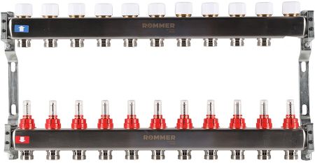 Коллекторы российской торговой марки Rommer серии RMS-1200 является важным элементом системы теплого пола, который позволяет произвести зональное распределение теплоносителя. В данной серии представлены модели с количеством контуров от 2 до 12. Коллекторная группа рассчитана ра боту при давлении до 6 бар.