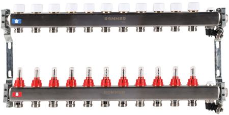 Коллектор Rommer (Роммер) 1″/3/4″x11 с расходомерами (RMS-1201-000011) — это полезное оборудование для распределения теплоносителя по независимым контурам, в каждом из которых устанавливается нужная температура при помощи специального регулировочного клапана. Устройство лучше всего подходит для систем отопления водяного пола.
