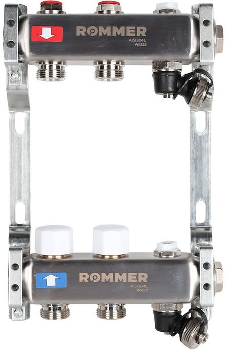 Коллекторные группы российской торговой марки Rommer серии RMS-3201 играют важную роль для создания многоконтурной системы отопления в зданиях жилого или административного типа. Оборудование может иметь от 2 до 12 раздельных контуров. На подающем и обратном коллекторах установлены воздухоотводчики и спускные краны.