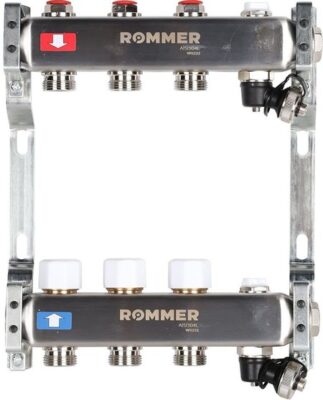 Коллекторные группы российской торговой марки Rommer серии RMS-3201 играют важную роль для создания многоконтурной системы отопления в зданиях жилого или административного типа. Оборудование может иметь от 2 до 12 раздельных контуров. На подающем и обратном коллекторах установлены воздухоотводчики и спускные краны.