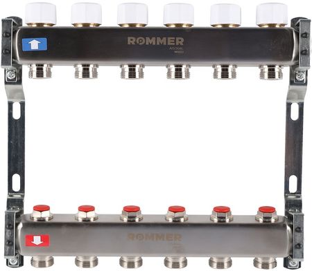 Коллектор Rommer (Роммер) 1″/3/4″x6 с запорными клапанами (RMS-3200-000006) позвоит эффективно разделить поток теплоносителя между помещениями. Часто используется в жилых малоквартирных домах. Максимальное количество контуров для данной модели составляет 6, на каждой линии установлен запорно-балансировочный клапан и клапан терморегулятора.