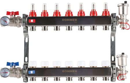 Коллекторы российской торговой марки Rommer серии RMS-1210 предназначены для распределения теплоносителя системы отопления по контурам. В линейке представлены коллекторы с количеством контуров от 2 до 12. Также представленное оборудование позволяет сбалансировать давление в системе и помогает удалять излишки воздуха.