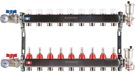 Коллекторы российской торговой марки Rommer серии RMS-1210 предназначены для распределения теплоносителя системы отопления по контурам. В линейке представлены коллекторы с количеством контуров от 2 до 12. Также представленное оборудование позволяет сбалансировать давление в системе и помогает удалять излишки воздуха.