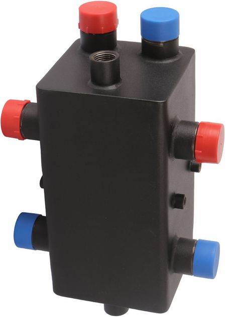 Коллектор от Rommer (Роммер) RDG-0018-004002 оснащен гидроразделителем внутри корпуса, что позволяет поделить полость на две части. Также, данное решение используется для предотвращения большой разницы потоков теплоносителя в контурах. Максимальная тепловая нагрузка при разнице в 25 градусов составляет 37.5 кВт.