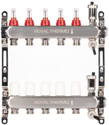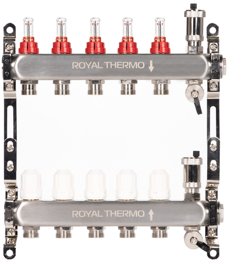 Коллектор Royal Thermo (Роял Термо) 1″ ВР-3/4″ НР, 5 выходов с расходомерами, нерж. (RTO 52.205) используется вместе с отопительными системами теплых полов для равномерного распределения теплоносителя. Коллектор отпрессован и поставляется со всем необходимым для быстрого и удобного монтажа.