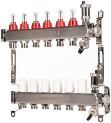 Серия Optimal российского бренда Royal Thermo представлена широким ассортиментом моделей коллекторов для отопления. Можно выбрать как универсальные коллекторы, так и, снабженные расходомерами. Каждая модель изготовлена из нержавеющей стали, устойчивой к высоким механическим нагрузкам и действию коррозии.