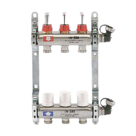 Коллекторные группы Uni-Fitt предназначены для распределения и регулирования потоков теплоносителя в низко- или высокотемпературных системах отопления. Оснащены регулирующими и термостатическими вентилями (с возможностью установки термоэлектрических приводов) на обратном коллекторе.