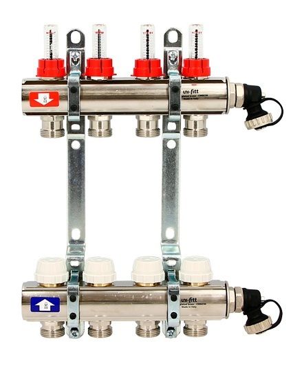 Коллекторная группа Uni-fitt (Юни-Фит) 1″ х 4 вых 3/4″ с расходомерами и вентилями(440I4304) позволяет контролировать подачу теплоносителя, повышая эффективность работы системы. При помощи коллектора можно создать 4 независимых контура, на каждом из которых уже установлен термостатический клапан.