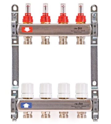 Коллектор для отопления Uni-fitt (Уни-фитт) 1″ х 4 вых 3/4″ с расходомерами и вентилями без конц, нерж. сталь производится в Италии. Расходомер работает в качестве клапана, который позволяет точно отрегулировать расход теплоносителя для каждого контура. Легкий монтаж и настройка, независимо от количества отводов.