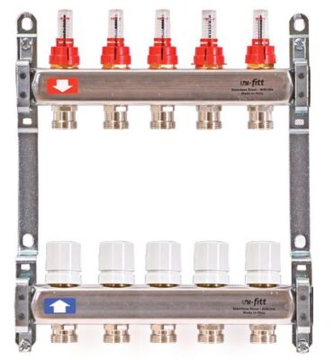 Uni-fitt (Уни-фитт) 1″ х 5 вых 3/4″ с расходомерами и вентилями без конц, нерж. сталь — коллектор, применяемый для распределения отопительной системы по нескольким комнатам/помещениям. Установка циркуляционного насоса предотвратит резкие перепады давления, что сохранит коммуникации от повреждений.