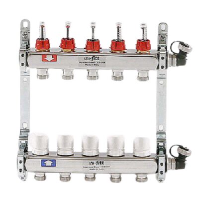 Коллекторная группа Uni-Fitt (Юни-Фитт) 1″ х 5 вых 3/4″ с вентилями без конц, нерж. cталь представляет собой комплектацию для подключения нескольких трубопроводов к одному источнику. Группа оснащена вентилями и не имеет концевых соединений. Коллекторы изготовлены из высококачественной нержавеющей стали, что гарантирует их долговечность и надежность.