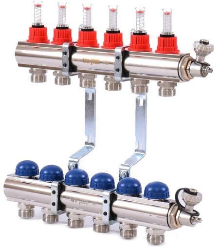 Коллекторные группы из латуни от итальянской торговой марки Uni-fitt серии E используются в системах отопления для распределения и регулирования потоков теплоносителя. У коллекторов данной линейки количество создаваемых отопительных контуров может варьироваться от 2 до 12. Модели представлены в комплектациях с расходомерами или регулирующими вентилями.