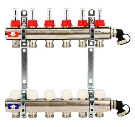 Коллекторные группы из латуни от итальянской торговой марки Uni-fitt серии I применяются низко- или высокотемпературных системах отопления. В линейке представлены модели, количество отводов у которых варьируется от 2 до 13. Коллекторы могут быть оснащены балансировочными вентилями или расходомерами.