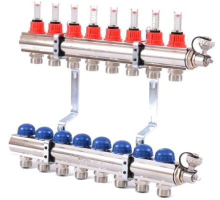 Коллекторные группы из латуни от итальянской торговой марки Uni-fitt серии E используются в системах отопления для распределения и регулирования потоков теплоносителя. У коллекторов данной линейки количество создаваемых отопительных контуров может варьироваться от 2 до 12. Модели представлены в комплектациях с расходомерами или регулирующими вентилями.