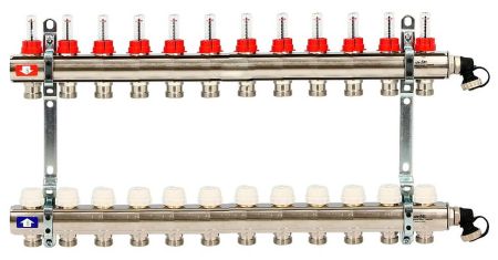 Коллекторная группа Uni-fitt (Юни-Фит) 1″ х12 вых 3/4″ с расходомерами и вентилями(440I4312) отличается широкой областью применения и обеспечивает эффективное распределение теплоносителя на 12 контуров. Преимуществом данной модели является наличие расходомера на каждом отводе подающего коллектора.