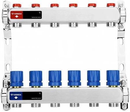VARMEGA (ВАРМЕГА) VM15506 1″, 6 x 3/4″EK представляет собой коллектор из нержавеющей стали, рассчитанный на 6 потребителей системы отопления (радиаторов, петель теплого пола , контуров). Его задачей является распределять, а также регулировать потоки рабочей жидкости. Оборудован двумя типами вентилей.
