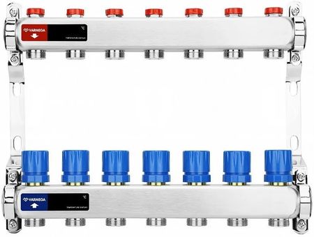 VARMEGA (ВАРМЕГА) VM15507 1″, 7 x 3/4″EK это коллекторная группа предварительной сборки, корпус которой сделан из нержавеющей стали, а отводы и вентили из латуни. Данное изделие состоит из двух коллекторов, соединенных кронштейнами. Модель оборудована двумя типами вентилей: балансировочными и термостатическими.