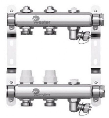 Коллектор для систем отопления Wester (Вестер) 1″-3/4 в сборе на 2 выхода с 2 заглушками это важный элемент в тех случаях, когда в доме используется несложная система контуров. Основная задача устройства смешивать и распределять теплоноситель через отводы. Коллектор может работать как с водой, так и с раствором с содержанием гликоля.