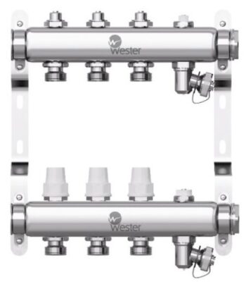 Коллектор для систем отопления Wester (Вестер) 1″-3/4 в сборе на 3 выхода с 2 заглушками применяется для распределения теплоносителя между контурами, это может быть вода или раствор гликоля. Устройство может использоваться для организации радиаторного отопления и для работы теплых полов. Коллектор имеет компактные размеры и легко монтируется на стену.