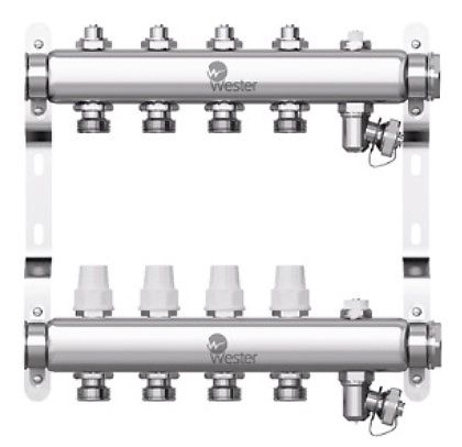 Коллектор из нержавеющей стали Wester (Вестер) 1″-3/4 в сборе на 4 выхода с 2 заглушками это оптимальный выбор для частного дома, когда необходимо организовать распределение теплоносителя между разными контурами отопления. Устройство удобно крепится на стену с помощью кронштейнов и не занимает много места.