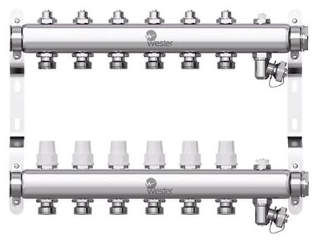 Коллектор для систем отопления Wester (Вестер) 1″-3/4 в сборе на 6 выходов с 2 заглушками обеспечивает распределение теплоносителя, нагретого котлом, между отопительными контурами. Модель изготовлена из качественной нержавеющей стали и комплектуется воздухоотводчиками, работающими в автоматическом режиме.
