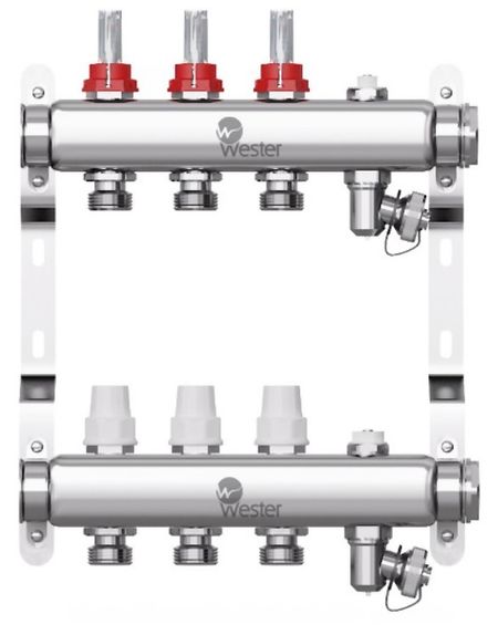 Коллектор из нержавеющей стали Wester (Вестер) 1″-3/4 в сборе с расходомерами на 3 выхода предназначен для увеличения производительности и эффективности использования систем отопления водяного типа, в том числе теплых полов. В качестве теплоносителя допускается использование воды или раствора гликоля.
